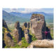 Man standing on the top of mountain on beautiful scenic clif background near Meteora monasteries in Greece. Back view, general plan