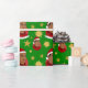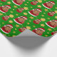 Christmas wrapping paper with illustration of a African American or Hispanic man with short black hair and red Santa Claus hat; in red circle on a green background with stars, with customizable text template for your name or message