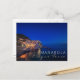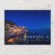 Postcard of the small town Manarola, 1 of the famous five Cinque Terre hill towns, built upon a cliff overlooking the Mediterranean Sea, with the lights on during Blue Hour in the beginning of the night in Liguria, Italy with the text 'Manarola, Cinque Terre'.