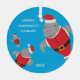 A Christmas ornament with three, cartoon, manatees in Santa outfits on a blue background. The ornament includes the words “Merry Christmas”, a name, and space for the year. Go add this fun ornament to your tree.