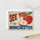 A charming Manchester New Hampshire vintage travel postcard featuring a lovely red apple, along with fun retro style text that says, "See you in Manchester"