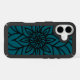 This phone case features a bold, intricate floral mandala design in deep teal and black. The symmetrical pattern radiates from the center, showcasing layered petals and flowing lines for a modern yet elegant look. Perfect for adding a touch of artistic flair to your everyday style.