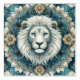 This is a stunning piece of artwork that showcases a stylized lion's face at its center. The lion's mane forms a mandala-like design, with flowing white and gray lines creating a sense of motion and texture. Surrounding the face are intricate patterns that layer outward, including floral and geometric shapes in shades of blue, teal, and beige. These elements contribute to a sense of depth and symmetry.