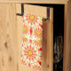 Kitchen towel in a twelve point mandala pattern in shades of brick red, rust, tan and mustard gold
