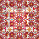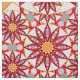 Twelve point mandala pattern in shades of coral red, peach, grey and white, outlined in black and accented with gold