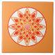 Twelve point mandala pattern tile in shades of coral pink, orange, mustard gold and white on a coral orange background