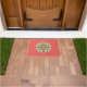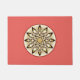 Doormat in a twelve point mandala pattern in shades of chocolate brown, tan and cream with a deep coral pink background