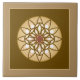 Ceramic tile in a twelve point mandala pattern in shades of tan, chocolate brown and cream with a dark chocolate brown background, framed in camel tan