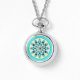 Twelve point mandala pattern in shades of turquoise, tan, navy, beige and gray on a turquoise background