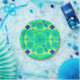 Twelve point mandala pattern in turquoise, blue, and shades of lime green accented with royal blue