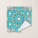 Towel set in a twelve point mandala pattern in turquoise, blue, white, and shades of grey / gray on a pale, silver grey background
