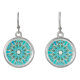 Twelve point mandala pattern drop earrings in turquoise, blue, white, and shades of grey / gray on a pale, silver grey background