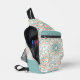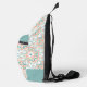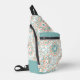 Mandala pattern sling bag in peach, teal, orange and white with optional personalization with a monogram in your choice of font styles, size and color with coordinating solid teal accents. Change or delete the sample text and circle frame in EDIT. ASSISTANCE: For help with design modification or personalization or if you would like coordinating items, contact the designer BEFORE ORDERING via the Zazzle Chat MESSAGE tab below or email makeitaboutyoustore@gmail.com.