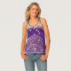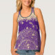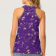 A stylish gold ornate lotus mandala on the bottom of the tank top with a purple backdrop and golden raining stars with a glittery gold edging around the collar for extra glam. Mystical boho chic
