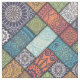 Graphic of assorted mandalas within square and rectangular shapes in a tiled design, warm muted colors, seamless repeat pattern