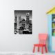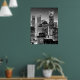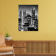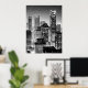 Poster in a semi abstract illustration of mid-town Manhattan in black and white, illuminated with city lights, under a starry midnight sky
