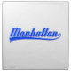 Manhattan, New York City, written with a swash (tail). Fonts in white and blue. Original text design.