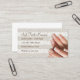 Manicurist business card template in a beautiful design including nicely manicured nails on soft hands, along with a pretty floral design background. Designed for services related to manicure, pedicure, nail tech, or beauty.