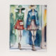 Jigsaw puzzle. Two fashionably dressed mannequins wearing hats and mini skirts walk confidently in front of a colorful background.
