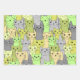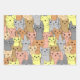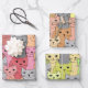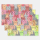 Many Cats Design Wrapping Paper Sheets in shades of reds, yellows and greens.