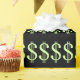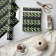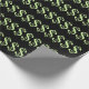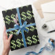 This wrapping paper design features many green dollar signs ($) on a black background. It would be a silly paper to use when giving a gift to somebody working in the financial sector.