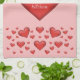 Destei's red hearts in different sizes on a blush pink background color. There is also a personalizable text area on the big heart in the middle.
