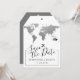 A luggage tag shaped destination wedding save the date with a faux silver foil world map with an editable heart location marker and romantic airplane icon. Select your own background color on the back side of the tag card to coordinate with your travel theme wedding colors.