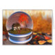 Inside a "snow globe" is an autumn landscape with a cottage overshadowed by maple and cherry trees. The surrounding field is filled with tall green and golden grass. Roses and ivy climb the wall of the little house. The maple tree is in brilliant fall color, and instead of snow there are maples leaves in shades of red, orange, and yellow swirling around in the globe and blanketing the grass.