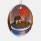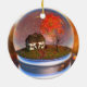 Inside a "snow globe" is an autumn landscape with a cottage overshadowed by maple and cherry trees. The surrounding field is filled with tall green and golden grass. Roses and ivy climb the wall of the little house. The maple tree is in brilliant fall color, and instead of snow there are maples leaves in shades of red, orange, and yellow swirling around in the globe and blanketing the grass.