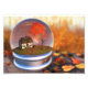 Inside a "snow globe" is an autumn landscape with a cottage overshadowed by maple and cherry trees. The surrounding field is filled with tall green and golden grass. Roses and ivy climb the wall of the little house. The maple tree is in brilliant fall color, and instead of snow there are maples leaves in shades of red, orange, and yellow swirling around in the globe and blanketing the grass.