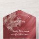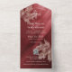 This fall wedding all-in-one invitation has a maroon color theme featuring subtle monochromatic maple leaves accenting a light to dark maroon gradient background - by katz_d_zynes