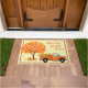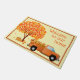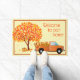 For those of you who live out in the country, this door mat will be such fun on your door step! There's an old orange pickup truck filled with leaves that is driving away from a large, brightly colored, red, orange, yellow and green maple tree with a pumpkin on the ground next to it. It is shown with "Welcome to our home" in plain text, but you can customize it with whatever you like. Door mat is trimmed in a light brown.