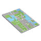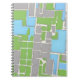 A bird's eye view of a city with various shapes and a color scheme of grey, green and blue.
