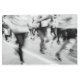 This black and white photograph captures the dynamic motion of a marathon race. Multiple runners are seen in mid-stride, their forms blurred to convey speed and movement. The focus is on the lower bodies and legs of the athletes, with the background intentionally blurred. A white line marks the lane on the asphalt road. The image evokes a sense of energy and competition.
