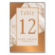 Elegant luxury looking modern wedding table number with editable text featuring faux metallic copper on beige tan and taupe grey marble patterned background ---------. Ideal for your winter | autumn fall indoor elegant trendy wedding.