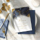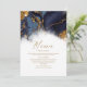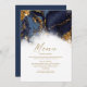 An abstract background reminiscent of marble in shades of navy blue veined with glittering gold is the backdrop for elegant script text and modern design layouts in the pieces of this beautiful wedding suite. The wedding reception menu shown here features the above plus optional flowing script text of 'Menu' and a template to add your menu selections and the bride and groom's names and wedding date on the reverse. Search ID644 to see all the coordinating pieces in this set.