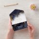 An abstract background reminiscent of marble in shades of navy blue veined with glittering gold is the backdrop for elegant script text and modern design layouts in the pieces of this beautiful wedding suite. The convenient, combined RSVP and wedding invitation shown here features the above design plus a template to easily add your pertinent wedding details. Search ID644 to see all the coordinating pieces in this set.