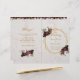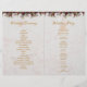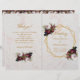 A folded wedding program on marble background, with burgundy red and white peonies decorations and an irregular gold hexagon around the text on the front cover, with peonies over it, up left and down right. There are also peonies garlands on the upper border inside and a small peonies decor under the text on the back cover.