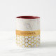 Girly, feminine and chic. White and gray marble stone print. Faux gold hexagon, geometrical pattern and a golden band with template for your name. With golden confetti. Dark golden colored letters.