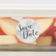 featuring title "Save the Date" in grey modern script font on white marble background.