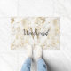 This chic, elegant design features a white and gold marble background. Personalize it with your monogram initial in gold colored serif font and your family's name in charcoal gray calligraphy script.