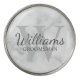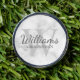 This divot tool features personalized groomsman's name in grey classic script font style with wedding details in grey classic serif font style and monogram in light grey classic serif font style as background, on white marble background.