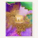 A sparkly, faux gold foil square with a script typography monogram initial overlays a rich, gold veined, purple, green, aqua, and pink watercolor background on this chic, elegant, trendy, custom name monogram spiral notebook. Personalize with your initial. 8 different inside paper designs to choose from. Makes a fun and stylish statement every time you use it. A great gift for a friend, as well as yourself!