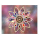 A pale but colorful fractal design like star clouds in outer space or multi-colored marble with shades of pink, mauve, peach, and blue. The background is a mottled texture like a distant nebula, and the piece is accented by a gold-framed starburst medallion as if inlaid with gold filigree. Completing the picture are smooth opal-like jewels and faceted gemstones inset in a golden floret.
