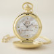 Handsome gold tone pocket watch with graphics of a white and gold marbled face with gold studs representing midnight, three, six and nine o'clock. Personalize the two letter monogram and the custom text as a great gift idea or something special for yourself.