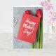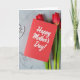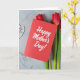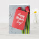 This card sits on a cool gray, marbled stone surface with faint natural veining, creating a calm backdrop for a romantic little still life ❤️. A rich red greeting card takes center stage, angled slightly off to one side as the main focal point. Across the front, smooth white flowing lettering carries the message, standing out clearly against the red. From behind the card on the right, three slender flowers rise upward, their deep scarlet petals leaning close as if drawn together like close friends. Their soft green stems trail downward and add a gentle, natural contrast to the crisp paper edges. In the upper left, a delicate white openwork heart-shaped decoration echoes the white lettering and adds a quiet touch of affection 🌼. Soft, even light highlights the paper texture, the flower petals, and the stone’s subtle veins, with the white heart detail resting near the top left corner.