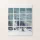 This jigsaw puzzle was created from a painting by Ohio Artist Terri Meyer titled "In the Holiday Spirit at Marblehead". The scene depicts a view of Marblehead from a paned window with snow and a snowman holding a US flag.