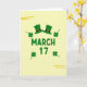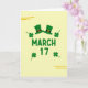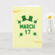 This greeting card features a buttery yellow background that sets a sunny stage for rich green and warm gold details, with a friendly St. Patrick’s Day feel 💚. Centered on the front, the large green text “MARCH 17” takes the spotlight, with “MARCH” above and “17” below in the same strong lettering. Just above the date, two green leprechaun hats sit side by side, slightly angled inward like they’re leaning closer in easy camaraderie ☘️. Each hat has a golden buckle that adds a small gleam against the green, echoing the gold accents elsewhere. Four deep-green four-leaf shamrocks are placed around the words—two near “MARCH” and two near “17”—creating a balanced, companionable circle around the date. Thin golden lines curl gently in the upper-left and lower-right corners, acting like soft corner flourishes that guide your eye back to the center. Share St. Patrick’s Day sentiments with someone special.