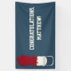 Add your own message to create a custom banner that's perfect for marching band members or anyone who loves a parade. This banner features a simple illustration of a marching band hat with feathers on the top in cream or ivory and dark red, set against a navy blue background.