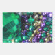 Photograph of Mardi Gras beads featuring a large green bead. The bead colors feature the gold, purple, and green colors of Mardi Gras celebration. Beads are also known as "throws" since they are thrown by krewe members to those watching the parade floats. This image can be customized to add your own text.